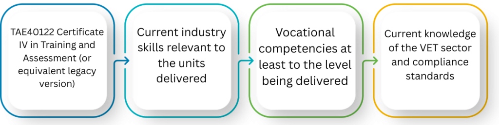 To deliver accredited training, trainers and assessors must meet the Standards for RTOs 2015 (Clauses 1.13–1.16).